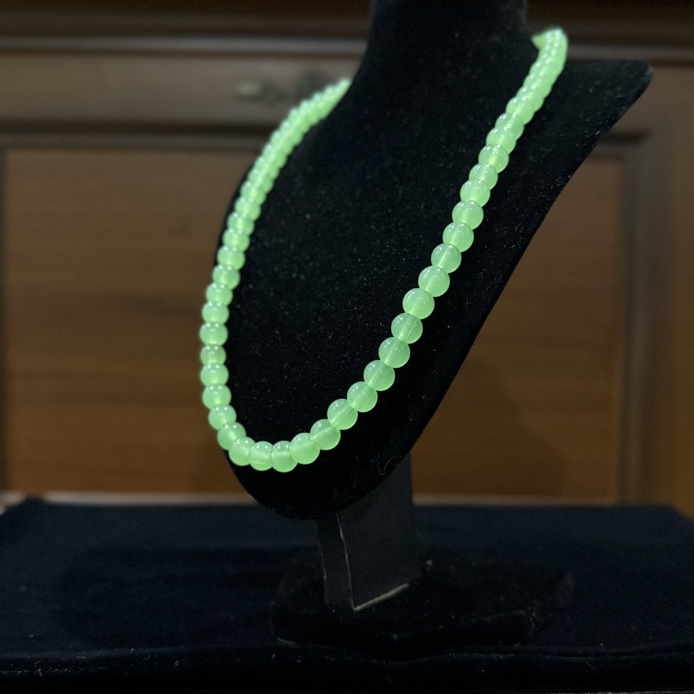 На фото витончене намисто з хризопразу, каменю соковитого світло-зеленого кольору з напівпрозорими переливами.