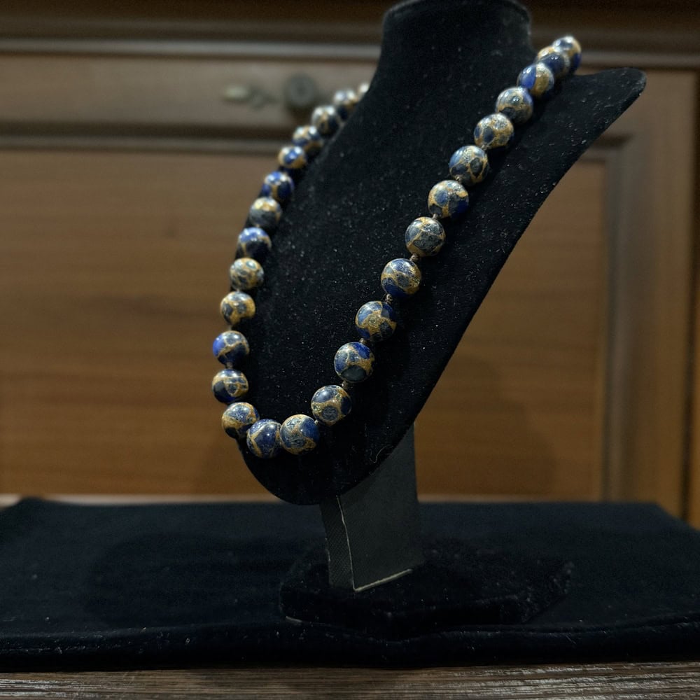 На фото представлена прикраса з круглих намистин лазуриту, які мають насичений синій колір з природними вкрапленнями золотистого піриту. Лазурит символізує мудрість і внутрішню гармонію, а пірит додає елементу розкоші.
